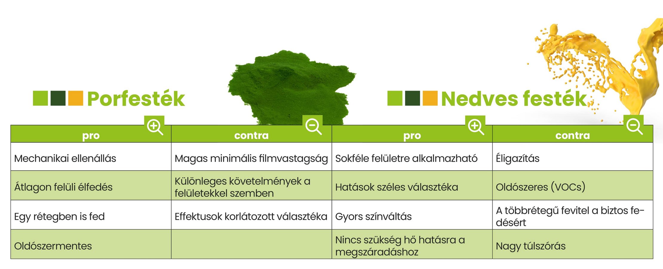 A nedves festék és a porfestékek közötti különbségek miatt vannak olyan felhasználások, ahol az egyik alkalmasabb, mint a másik.