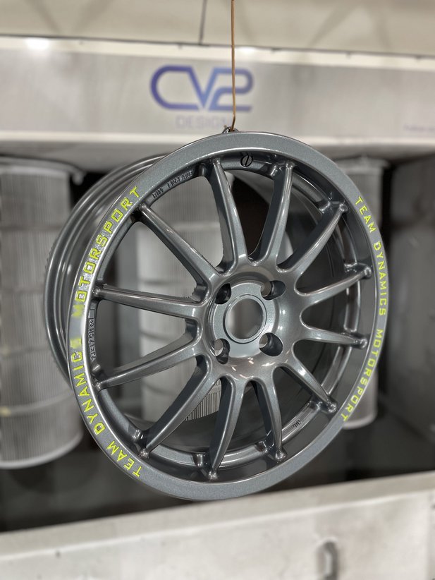 3. Podkład i lakier bazowy: Aby zapewnić optymalną ochronę przed korozją, przed warstwą tworzącą efekt na felgę nakładany jest podkład. Następnie nakładana jest druga warstwa w pożądanym kolorze i fakturze. W praktyce podkład nie jest w pełni utwardzany przed nałożeniem lakieru bazowego, a jedynie "żelowany" (50-70% czasu utwardzania zgodnie z oknem utwardzania). Zwiększa to przyczepność następnej warstwy. Oszczędza to również czas i energię.