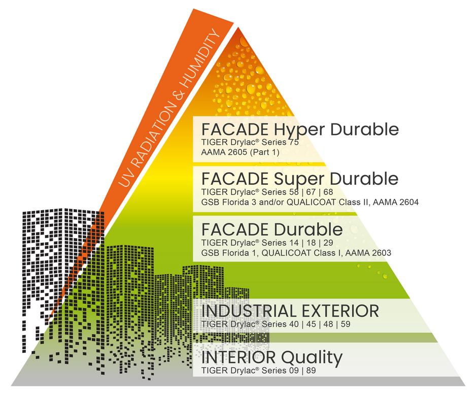 Our super durable powder coatings stand for maximum resistance to UV radiation and weathering. Chemically, they are based on a Class 2 system according to Qualicoat and meet the requirements of GSB International Florida 3. This makes them a premium solution for architectural façade finishing.